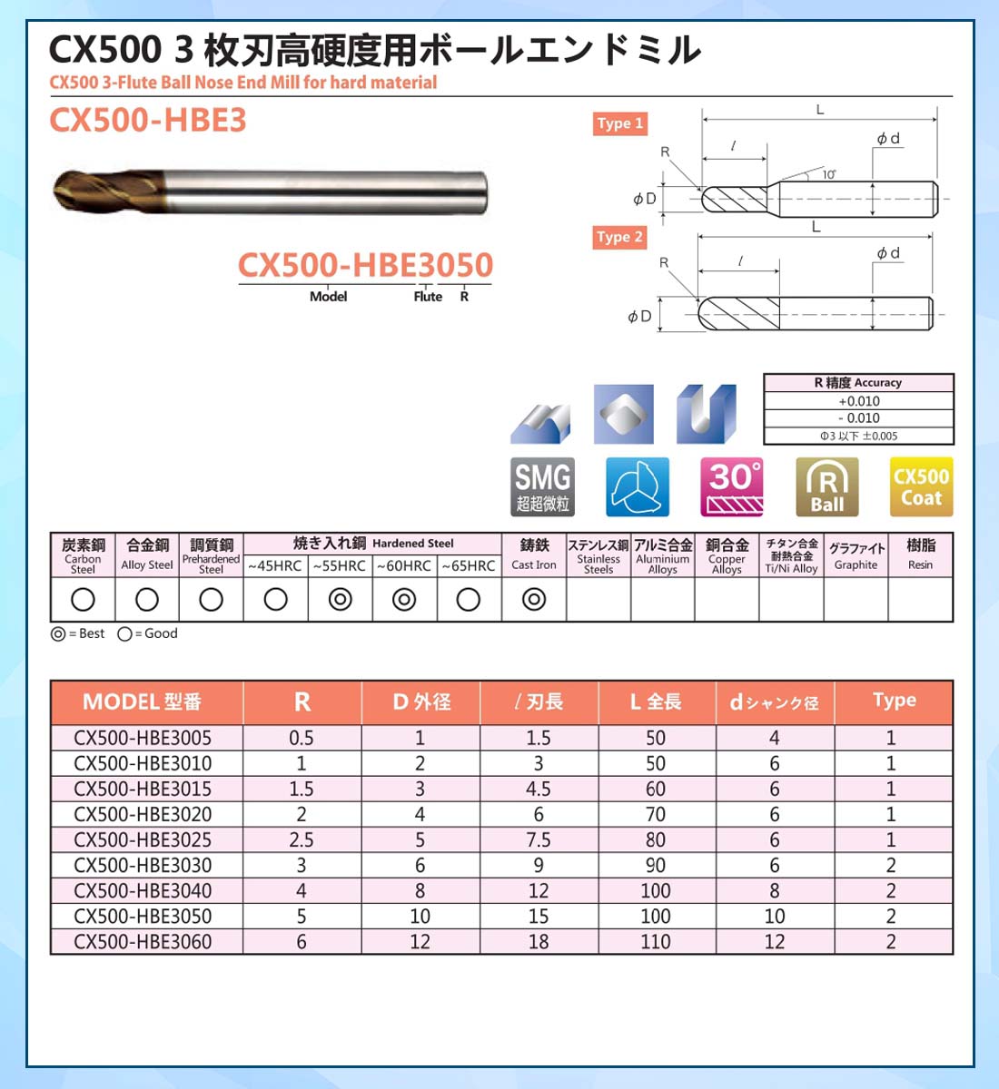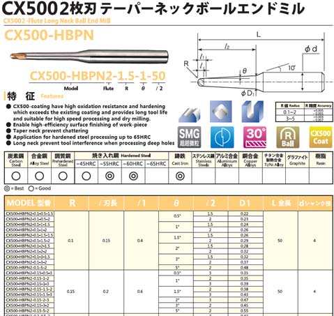 • Thép hợp kim, S45C/SCM440, NAK đến HRC45 và thép cứng lên đến 65 HRC: CX500-HBE2 và CX500-HBE3 đều cho kết quả gia công tốt nhất.