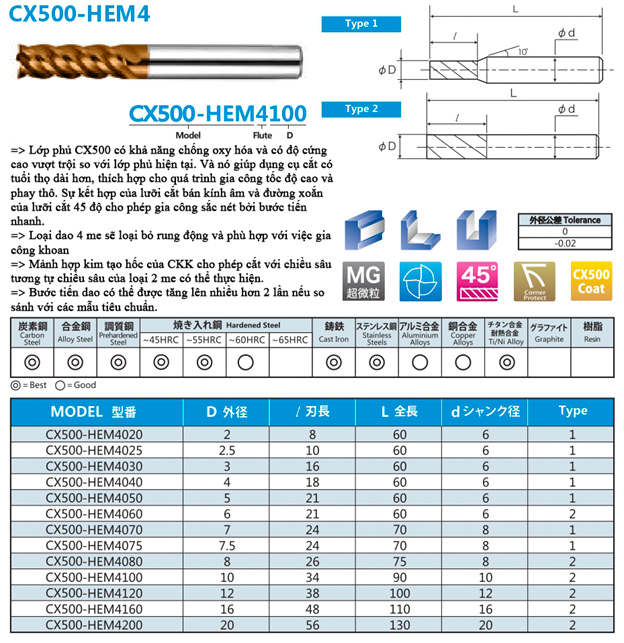 • Thép các bon, thép hợp kim, thép cải thiện nhiệt, gang, inox, hợp kim nhôm, hợp kim đồng: Đều đạt hiệu quả cao khi sử dụng CX500-HEM4.