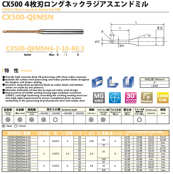 • Lớp phủ CX500 không chỉ giúp kéo dài tuổi thọ của dụng cụ cắt mà còn nâng cao khả năng kháng axit khi gia công khô, tối ưu hơn so với các lớp phủ hiện hành trên thị trường. Đây là sự lựa chọn lý tưởng cho việc gia công ở tốc độ cao.
