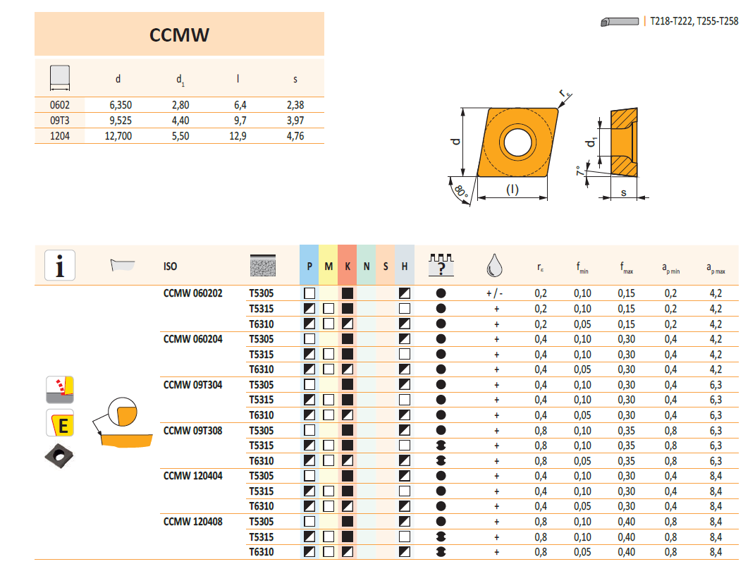 Thông số về mặt hình học, kích thước, kiểu dáng, màu sắc của chíp tiện CCMW được thể hiện như bảng bên dưới.