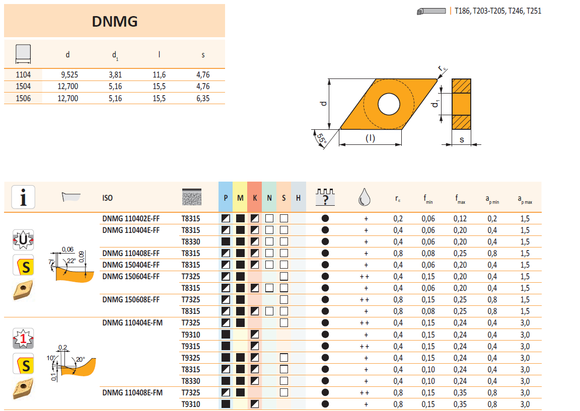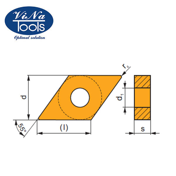 Thông số về mặt hình học, kích thước, kiểu dáng, màu sắc của chíp tiện DNMG được thể hiện như bảng bên dưới.